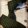 Corbata tricotada, azul marino, bordes finos blancos y central en rojo.